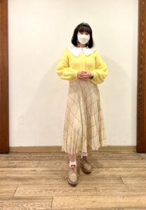 スカートは細かいプリーツで、ブラウスの襟元も合わせて上品に🌼