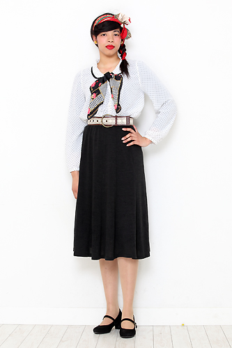 頭と胸元のスカーフに目が奪われますね! 髪にスカーフが編み込まれているのがカワイイ♡ ダークトーンのコーデの中で、赤いリップが綺麗に栄えています。