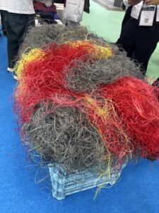 このカラフルでくるくる丸まっているのが漁網です。この会社は漁網をアップサ