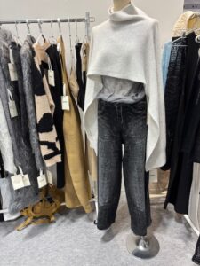 わかりにくいかもしれませんがニットパンツにデニム柄をプリントし、上に来ている針抜きニットは非常に軽く