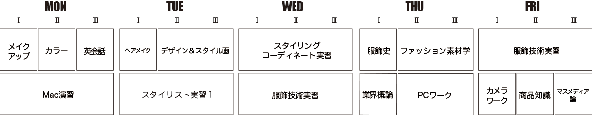 MON TUE WED THU FRI 前期 後期 前期 後期 前期 後期 前期 後期 前期 後期 1・2限 スタイリスト業界研究 カメラ撮影実習 スタイリング スタイリスト実習1 SNS活用術 3・4限 服飾技術実習 ヘアメイク スタイル画&デザイン クリエイティブグラフィックス スタイリスト実習1 色彩学 英会話 メイクアップ