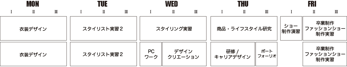 MON TUE WED THU FRI 前期 後期 前期 後期 前期 後期 前期 後期 前期 後期 1・2限 スタイリスト実習2 スタイルコーディネート論 衣装・服飾技術 キャリアデザイン 卒ショー制作実習 3・4限 Excel & Word講座 ファッション