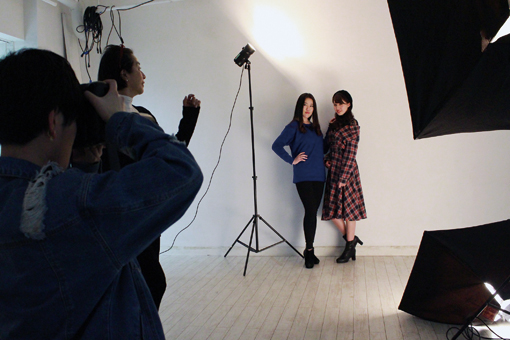 プロのカメラマンとのコラボ授業。シャッター音に合わせて、表情やポーズを巧みに変えていく技を学び習得。