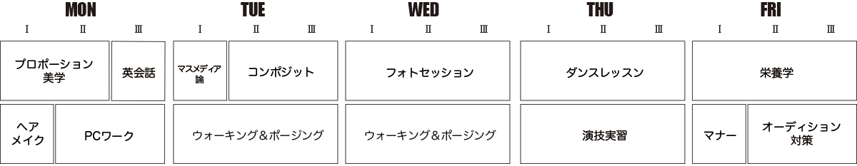 1・2限プロポーション美学英会話ヘアメイクSNS活用術フォトセッションダンスレッスングラフィック実習オーディション対策