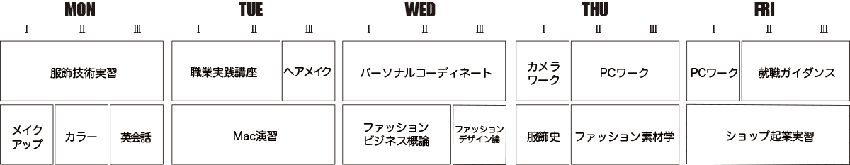 MON TUE WED THU FRI 前期 後期 前期 後期 前期 後期 前期 後期 前期 後期 1・2限 服飾史 素材学 カメラ撮影実習 ヘアメイク トレンド分析・パーソナルコーディネイト ショップ起業実習 SNS活用術 3・4限 ファッションビジネス概論 販売実務演習 就職ガイダンス 服飾技術実習 クリエイティブグラフィックス 色彩学 英会話 メイクアップ