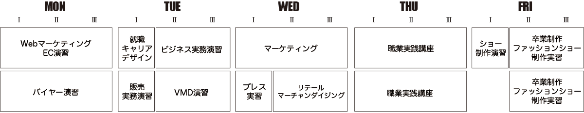 MON TUE WED THU FRI 前期 後期 前期 後期 前期 後期 前期 後期 前期 後期 1・2限 企業連携実務講座 マーケティング ファッションジャーナリズム キャリアデザイン 卒ショー制作実習 3・4限 バイヤー論 PR実習 映像表現 Excel & Word講座 MD論 デジタルコミュニケーション技術 キャリアデザイン 卒ショー制作実習