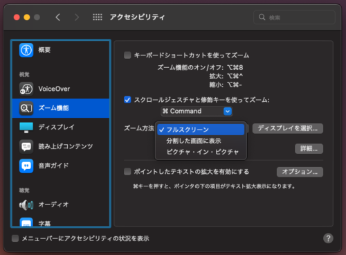 ここでキーボードでズームする方法や、マウスのスクロールでズームする方法など、