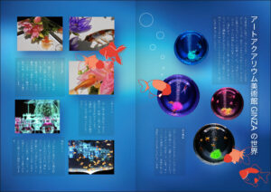 水槽の丸い窓の形を活かした切り抜き写真は、水中を漂う泡の様にも見えます。
