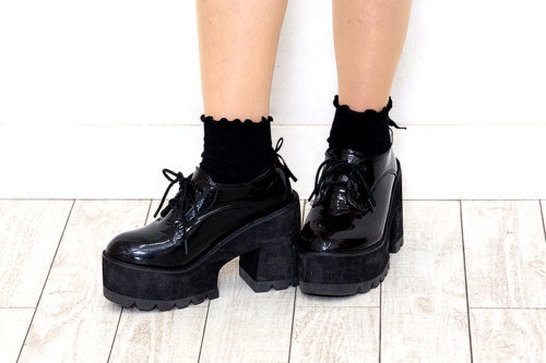 全体の雰囲気を締めるため、足元はブラックをチョイス! 「BUBBLES」の厚底はカジュアルにもフォーマルにも使える優れもの。太ヒールなので安定感があり、歩きやすいんです♪