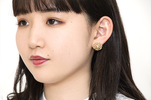 「H&M」のお花のピアスも、ゴールドで合わせて小物のまとまりが◎