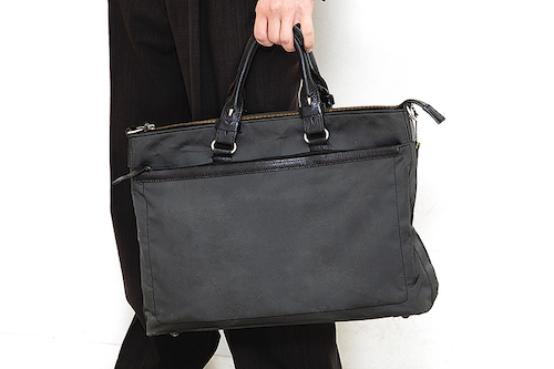 鞄でビジネスライクなアイテムを取り入れたのも遊びの狙いの一つ。