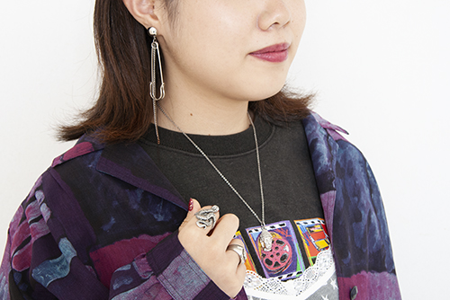「アクセはシルバーが好き! 蛇や植物、大仏の顔など、個性的で人と被らないデザインの物を選んできました☆ 安全ピン型のピアスは、シンプルだけど存在感がスゴくて、顔周りに簡単にポイントを作ってくれるアイテムです♡」
