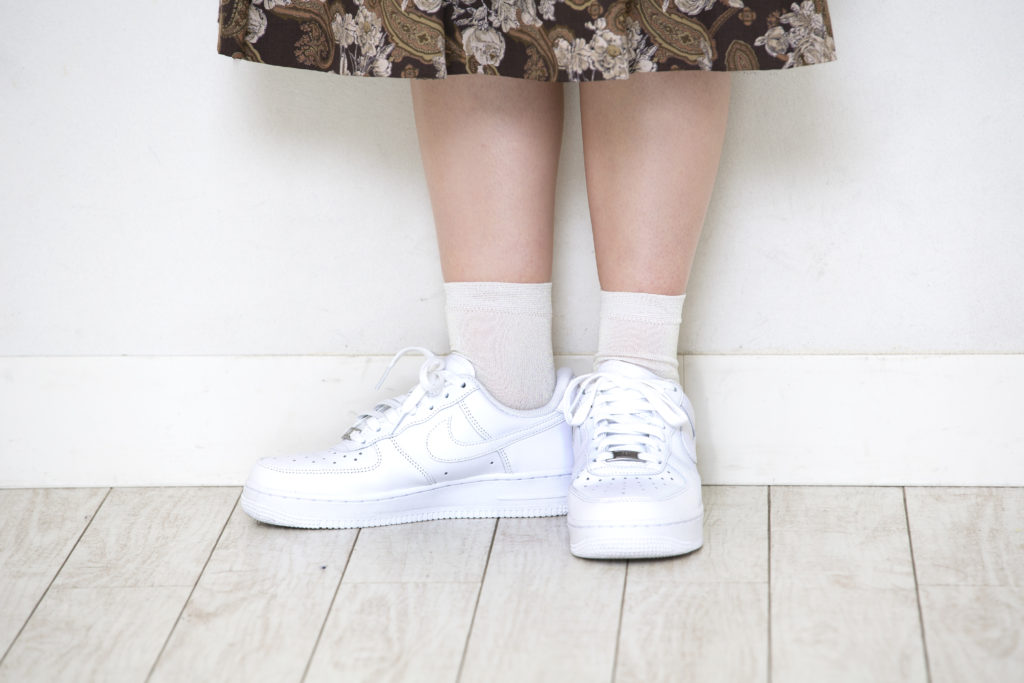 足元はシンプルに白でまとめました。おニューのスニーカーは、お父さんからのプレゼント♡ 家族みんな、Nikeのエアフォースワンを持っているんだって!