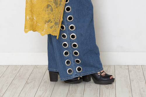 「このデニム、サイドのハトメがカワイイ&セクシー♡ ちらっと肌が見えるので、重くなりすぎないんです。このレースアップのサンダルもお気に入りで、リピート必須アイテムです!」
