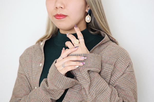 成人式の前撮りに合わせてしたネイルは、とってもゴージャス! 動く度キラキラ光ってオシャレです。アクセは基本シルバーで統一しつつ、あえて1つだけゴールドで外すテクニック。オシャレ女子は指先までテを抜きません!