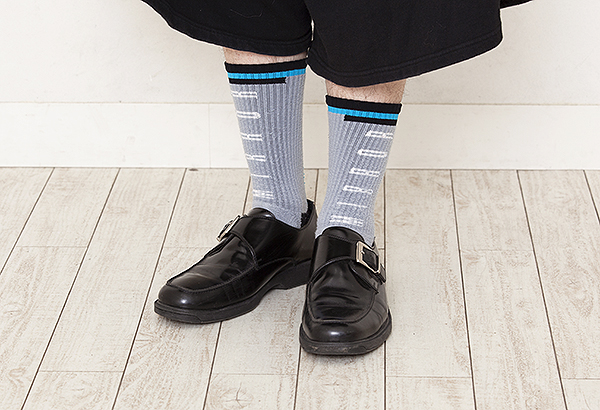 真っ黒コーデのアクセントは、この靴下! 立っているときは見えないけど、座った時などにチラッと見えるのがこだわりなのだとか。見えにくい細部まで意識してコーデしているのは、まさにオシャレ学生! ですね♪
