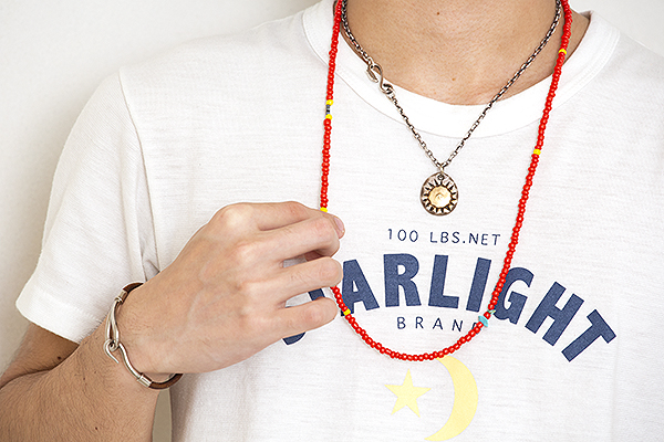 夏らしいビーズのネックレスがポイント★ 鮮やかな赤色は、白Tシャツにもピッタリ。シンプルなコーデの差し色としても活躍しています。写真映えも意識しているのが、さすがモデルコースといったところ♪