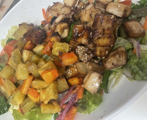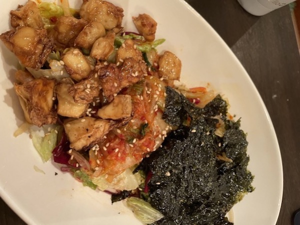 ↑このサラダはオーブンでとうふをローストし、カリカリになるまで焼いて、キムチと韓国海苔をトッピングしました!