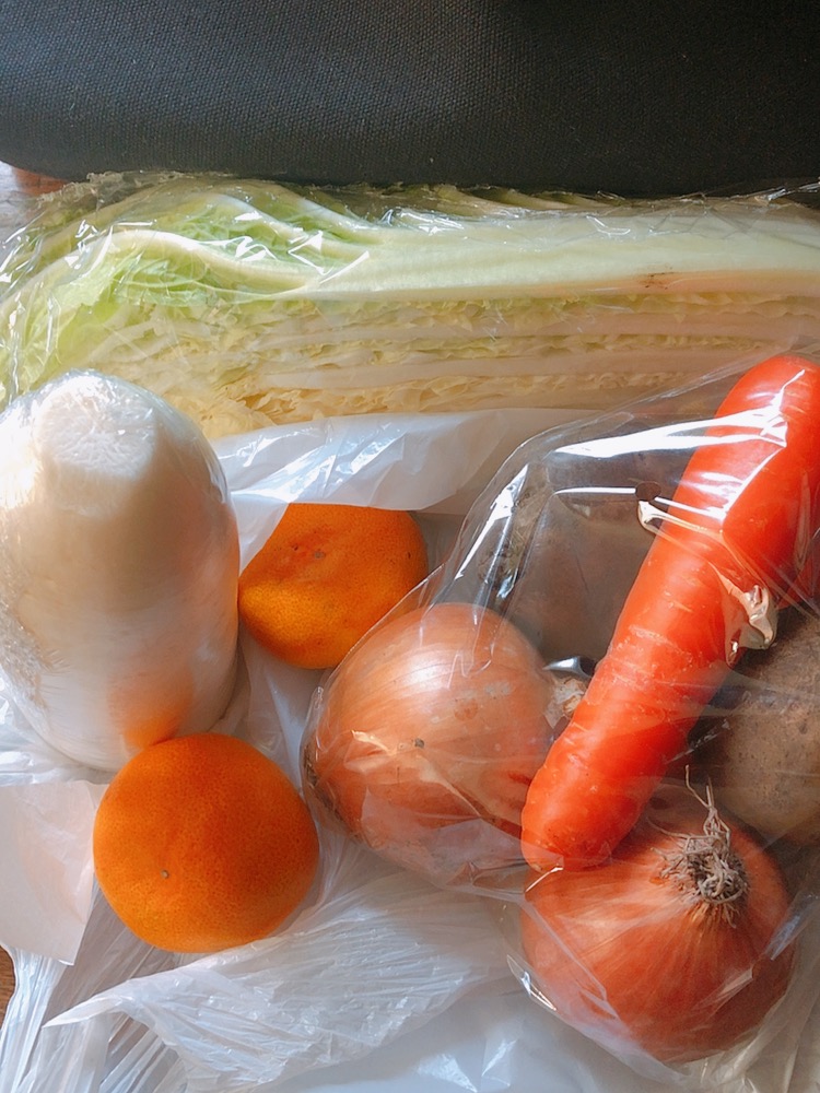 袋の中には人参🥕、みかん🍊、玉ねぎ、