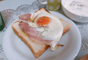 良心的なパン屋さんに行ったのでベーコンエッグをパンに乗せて見ました!