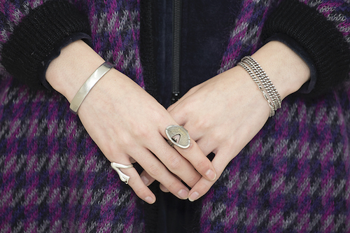 ネックレスをブレスレットにして自分らしさを出しつつ、色味はシルバーで統一した上級者テクニック! ぜひ参考にしてみてくださいね。