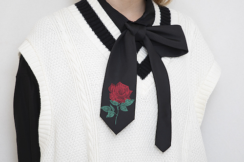 メンズライクなアイテムの印象が強いネクタイを、あえてリボンのように結んで可愛らしく。