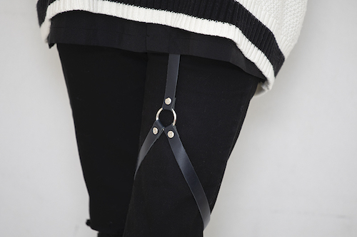 手作りのアイテムを使って、シンプルな着こなしにワンポイント。細くスラッと伸びる足に、レッグハーネスがとってもかっこいいです!!!