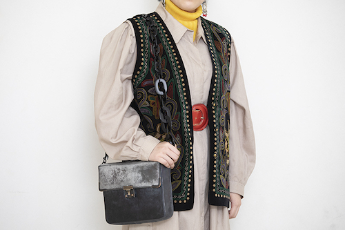 古着のバッグには、ショルダーストラップの代わりにネックレスを使ってみるという、Bitoさんの遊び心を感じられるポイントが♪