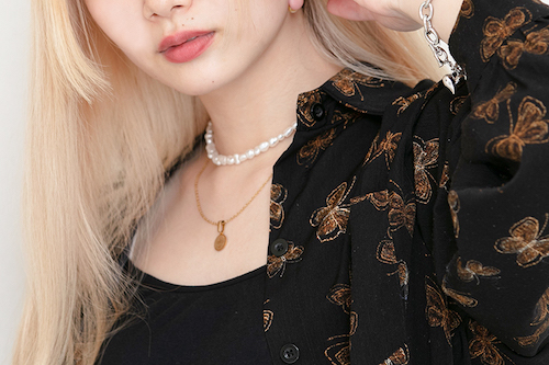 重ね付けしているネックレスなど、女性らしさをプラスする小物使いも要チェック!