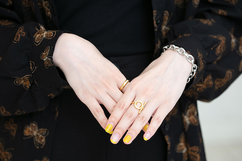 手元で色味をプラス。 友達にやってもらったというジェルネイルは、ツヤッとした質感もGood!