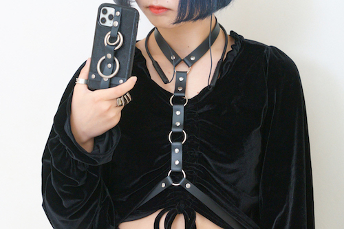 首元から繋がるハーネスと、「ニュリカデリック」のスマホケースが見事にリンク! スマホもファッションの一部になっています!