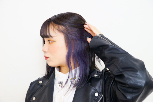 さりげなく見える紫がコーデにしっくり。オレンジ系のアイメイクもより引き立ちますよね^^ インナーカラーは、入れる場所や範囲によって印象が違って楽しい♪