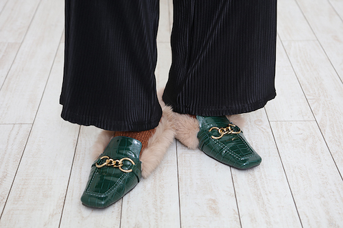 「SHEEN」で購入した靴は、フェイクファーがついた華やかなデザイン。友達にはワニのようだと言われるそうです笑 茶色の靴下との相性も抜群で可愛い♪