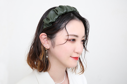 「自分を表しているようなピアスの並びにしてみました」 いつも必ず身につけているのがパール。どんなコーデにも合うので、アクセサリー選びに迷ったらぜひ。カチューシャは幅広をチョイスして、オシャレに上手に小顔効果!