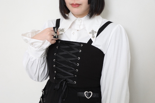 手作りのブラウスは、大きめの襟とカフス部分にKoujiさんのこだわりが☆ トレンドのビックカラー&十字架のモチーフが、さらに目を引きますよね。