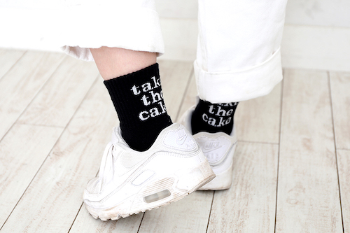 しゃがんだりしたときに、さりげなく見えるロゴ入りのくつ下がキュート! あまり見えない所にも遊びポイントがあって、さすがオシャレ学生です◎