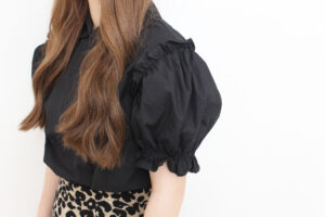トップスにフリルがついていて甘めなので、ヒョウ柄の