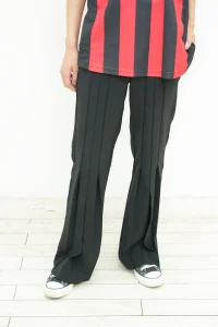 目を引くユニフォームにボトムスはフレアパンツをチョイス。