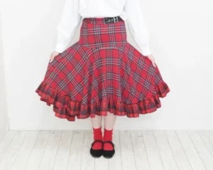 「赤チェックコーデ」