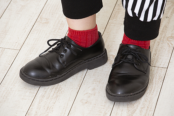靴下はシャツの色と合わせてレッドをチョイス! モノクロに赤、というのは差し色にもなるので使い勝手もいいんです♪ 足元に明るい色があれば全体が重くなりすぎないので、派手色ソックスにぜひ挑戦してみて♡
