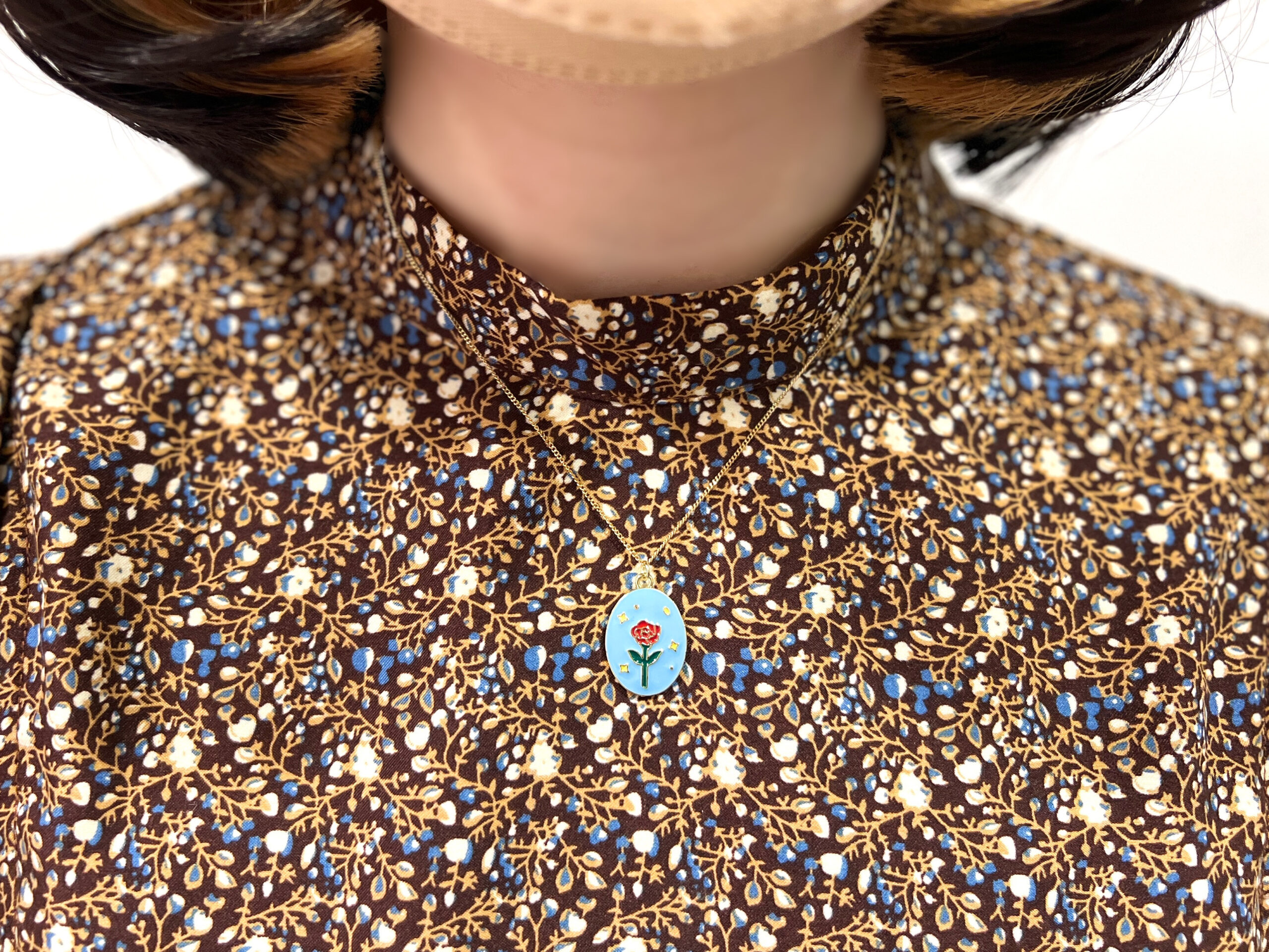ネックレスはワンピースの柄の青に合わせて、水色をチョイス。