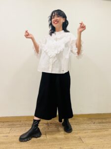 甘くなり過ぎないようにワイドパンツを履いてゴツめのブーツを合わせたのがポイントかな!