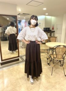 ブラウンのボーダーTシャツにブラウンのスカート〜〜