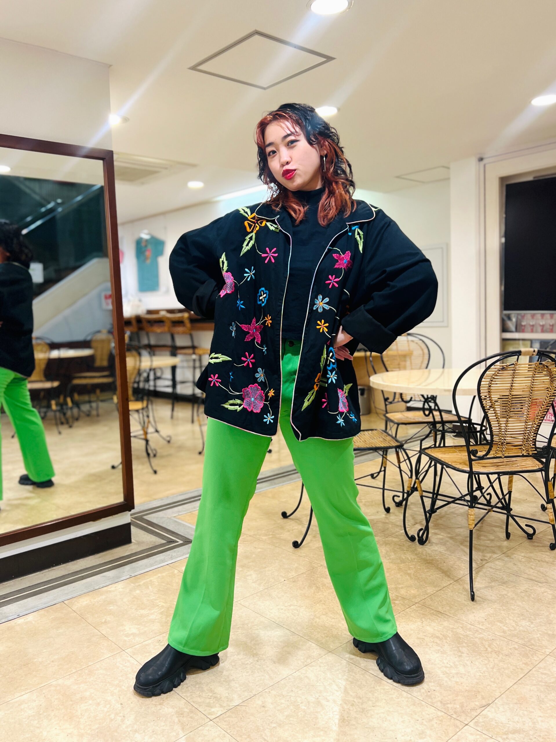 お花の刺繍が施されている大好きな羽織にグリーンのパンツを合わせて、THE古着スタイル!