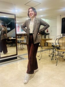 下もコーデュロイ生地のパンツで秋らしさを表現🎃