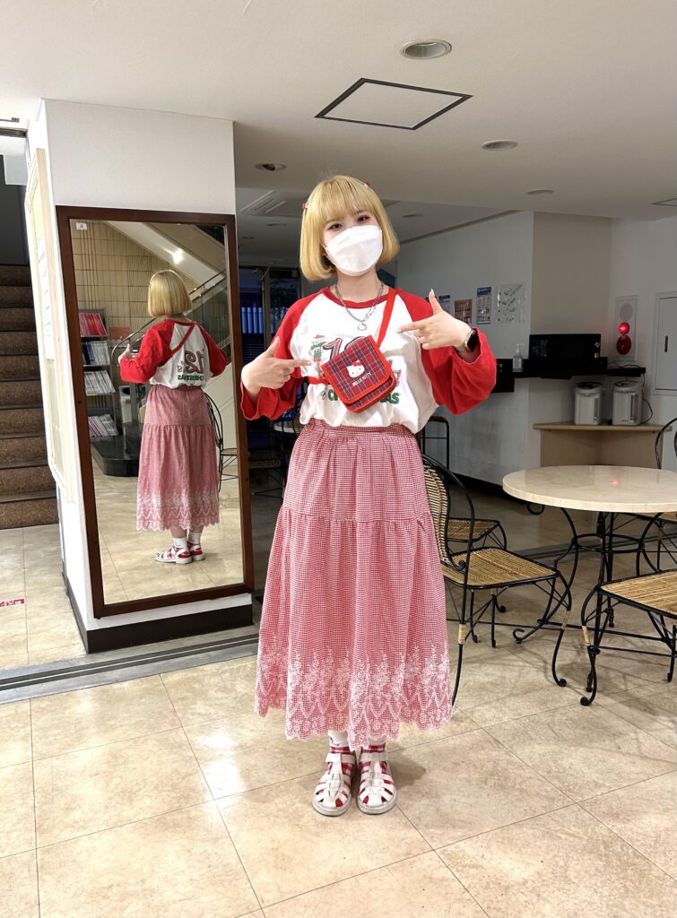 キティちゃんを意識した赤のトップスとスカート。