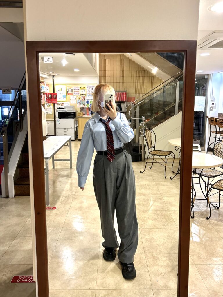 下はグレーのパンツで制服風に◎