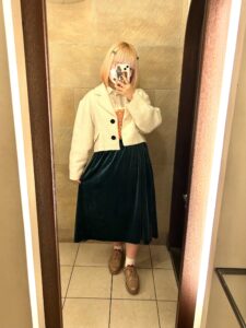 鮮やかな深いグリーンのスカートを主役にオレンジベストと