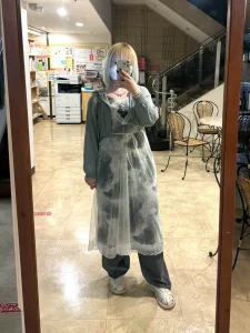 グレーのキャミワンピの上にシースルーワンピを重ねて、