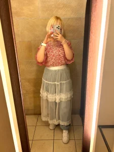赤ギンガムチェックのトップスは襟元がレースになっていて